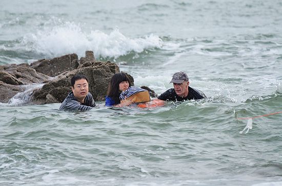 四月末的青島,海水依舊冰冷。腳剛一進(jìn)水,刺骨得冰冷。兩人向礁石挪動了不到5米,海水已經(jīng)淹沒到腰部。岸上的人焦急地喊道:“看著點?。?rdquo;浪花一個接一個打過來,也把沿岸的海水打渾了,寇海濤只能用腳探著海底摸索著往前走。臨近礁石不到一米的距離,海水一下淹到了寇海濤的肩膀,冰冷的海水頓時讓人有種喘不過氣的感覺??芎镒∫豢跉猓瑠^力往前一沖,猛地爬上礁石。緊跟后面的老外正要爬上礁石,腳下一滑,身體向右側(cè)了過去,緊跟著一個浪頭打過來,老外被打得身子又向左面滑去,差點摔倒在水里??芎姞钜话牙±贤猓阉狭嗣娣e不大的礁石。