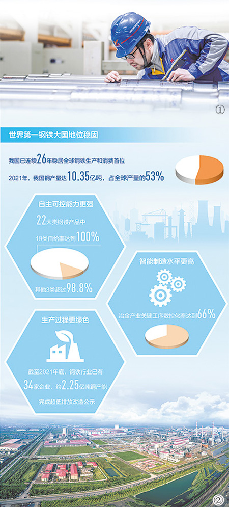 據(jù)中國鋼鐵工業(yè)協(xié)會(huì)統(tǒng)計(jì),與2012年相比,2021年,重點(diǎn)鋼鐵企業(yè)的平均噸鋼綜合能耗已由602.71千克標(biāo)煤降至550.43千克標(biāo)煤,與世界先進(jìn)水平的差距大幅縮??;噸鋼二氧化硫、煙粉塵的排放量降幅也分別達(dá)到了81.41%、63.44%。