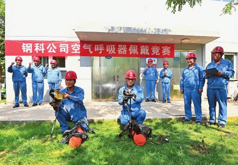鋼科公司空氣呼吸器佩戴競(jìng)賽現(xiàn)場(chǎng)。 王瑞瑞 攝
