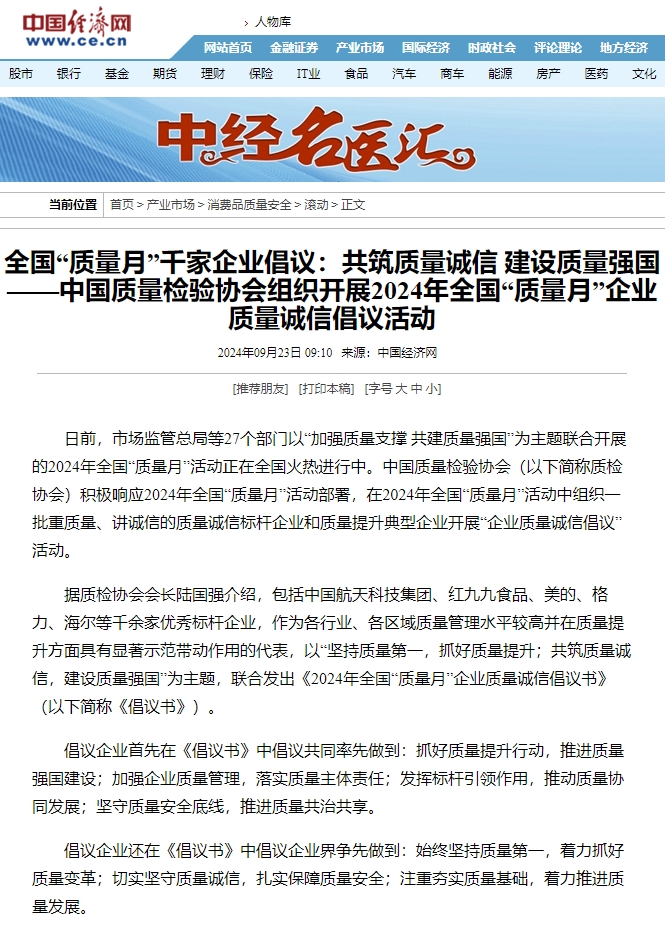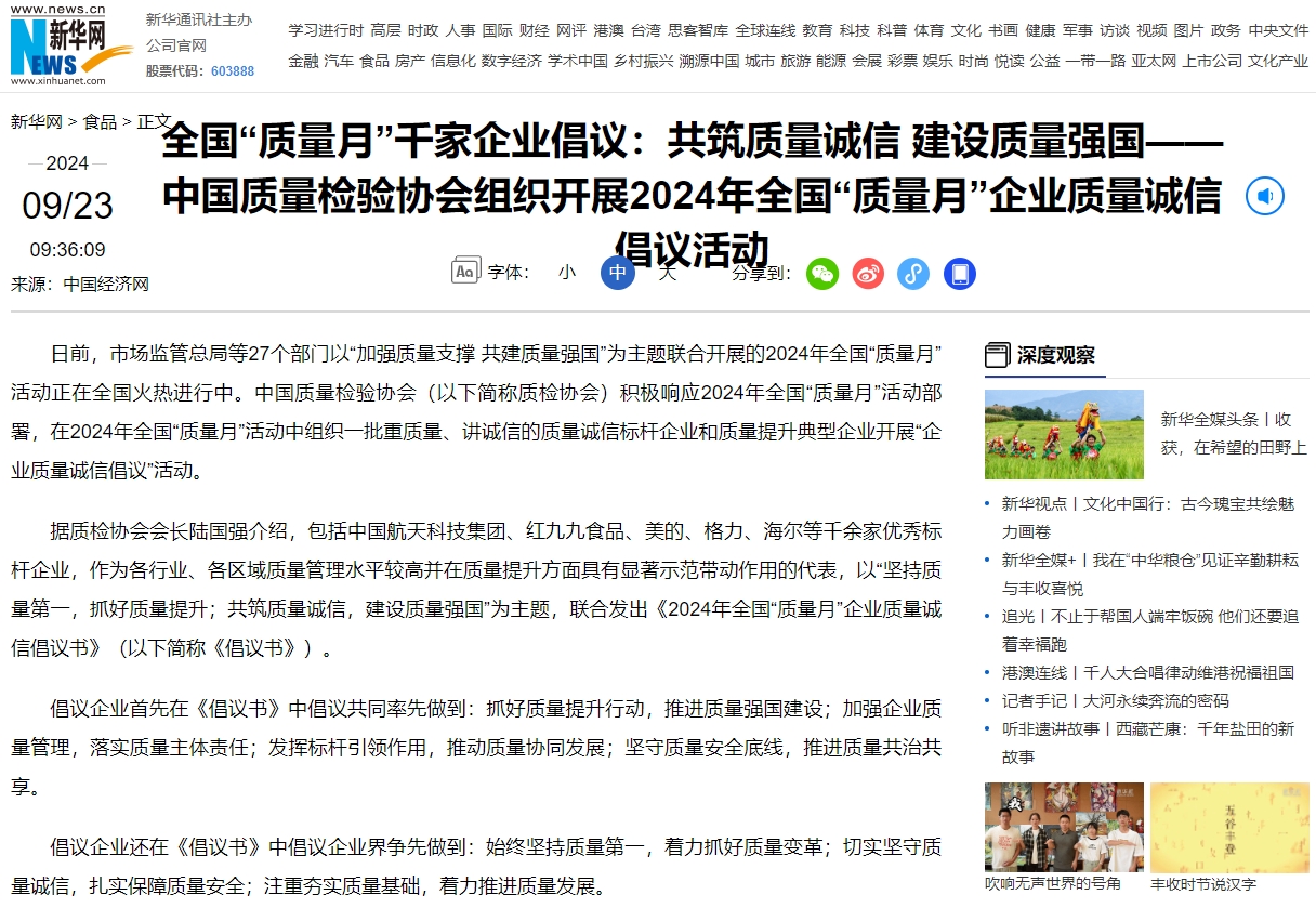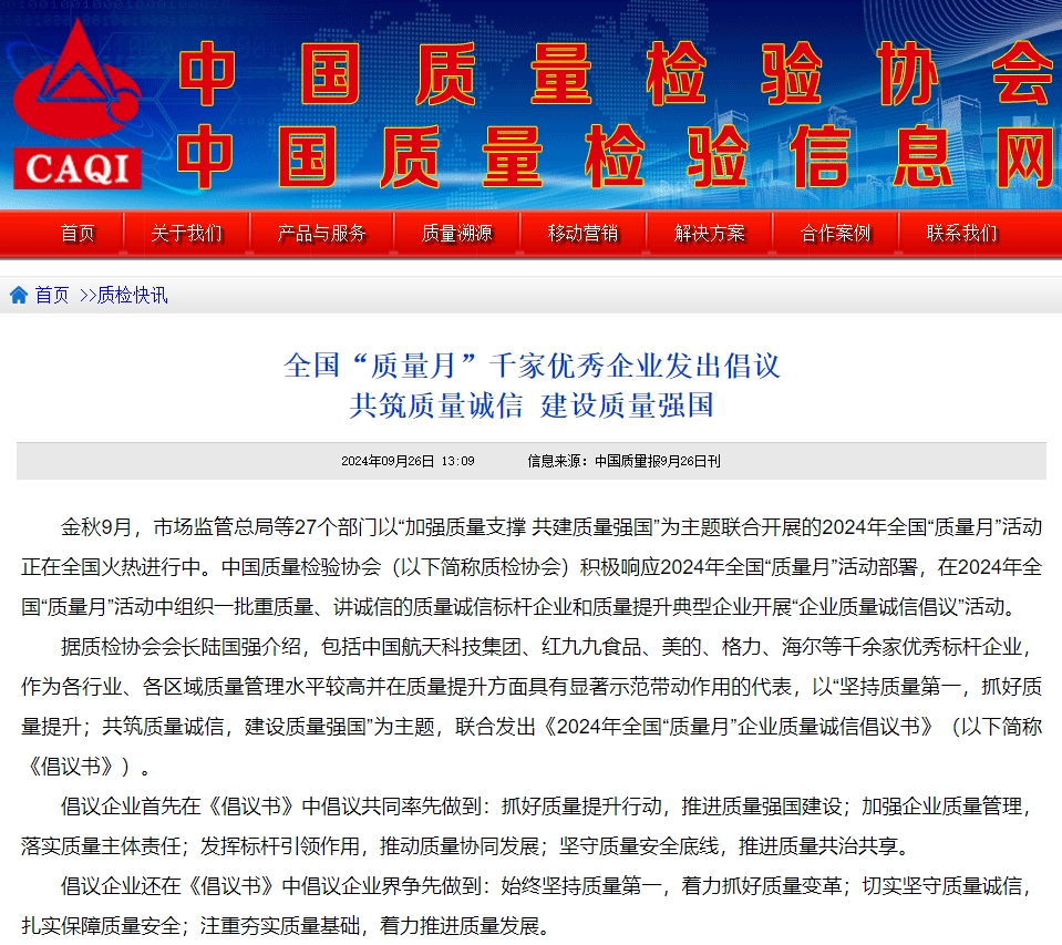 每年9月是全國(guó)“質(zhì)量月”,由市場(chǎng)監(jiān)管總局等27個(gè)部門(mén)以“加強(qiáng)質(zhì)量支撐 共建質(zhì)量強(qiáng)國(guó)”為主題,聯(lián)合開(kāi)展的“質(zhì)量月”活動(dòng)。在2024年全國(guó)“質(zhì)量月”活動(dòng)中組織一批重質(zhì)量、講誠(chéng)信的質(zhì)量誠(chéng)信標(biāo)桿企業(yè)和質(zhì)量提升典型企業(yè)開(kāi)展“企業(yè)質(zhì)量誠(chéng)信倡議”活動(dòng)。