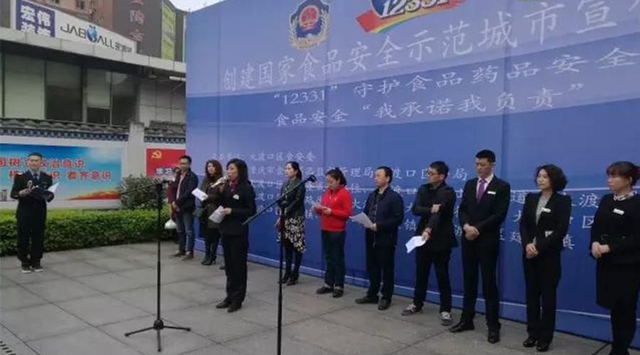 3月31日上午10點,大渡口步行街熱鬧非凡,除了跳廣場舞的大媽,還有一個個展臺吸引人眼球,展臺邊是大渡口區(qū)食藥監(jiān)分局的執(zhí)法人員,正在向群眾分發(fā)著相關(guān)食品安全知識的手冊和海報。緊接著,在分局執(zhí)法人員的帶領(lǐng)下,轄區(qū)食品生產(chǎn)企業(yè)、餐飲單位、食品流通企業(yè)代表,進行了“食品安全我承諾我負責”的宣誓。