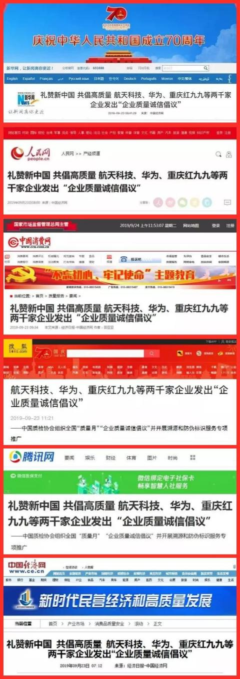 中國質(zhì)量檢驗協(xié)會(以下簡稱質(zhì)檢協(xié)會)在活動中組織重慶紅九九食品等近兩千家重質(zhì)量、講誠信的質(zhì)量誠信標桿企業(yè)和質(zhì)量提升典型企業(yè),開展“企業(yè)質(zhì)量誠信倡議”專題活動。并以“堅持質(zhì)量第一 抓好質(zhì)量提升 共筑質(zhì)量誠信 建設(shè)質(zhì)量強國”為主題,以人民為中心,樹立消費者至上的理念,把維護廣大群眾的根本利益作為“質(zhì)量月”活動的出發(fā)點和落腳點,聯(lián)合發(fā)出《2019年全國“質(zhì)量月”企業(yè)質(zhì)量誠信倡議書》,倡議企業(yè)界爭先做到弘揚工匠精神、齊抓質(zhì)量提升、重視質(zhì)量發(fā)展、共創(chuàng)中國質(zhì)量,以優(yōu)異成績慶祝中華人民共和國成立70周年。此次活動引起社會廣泛贊譽。